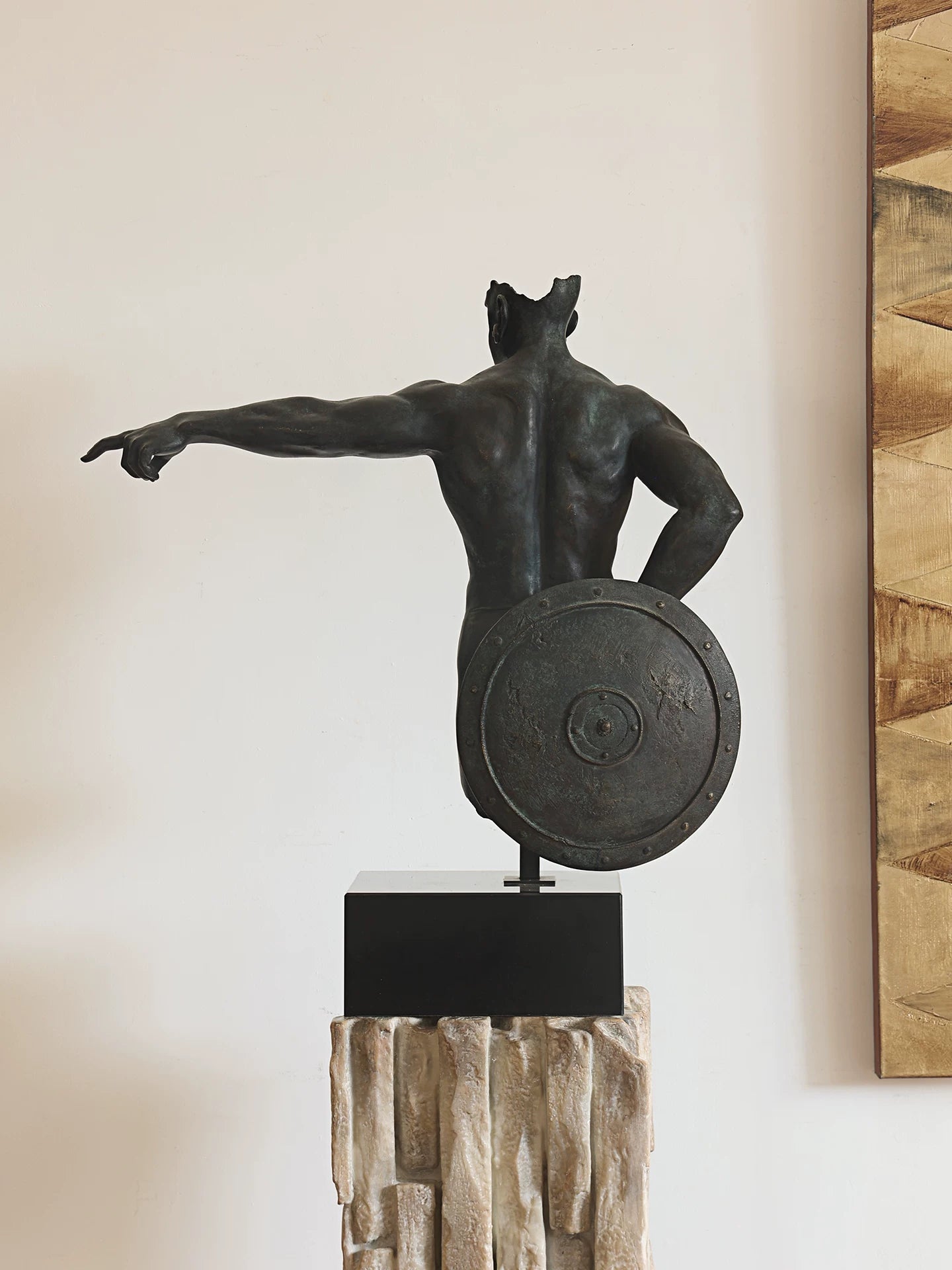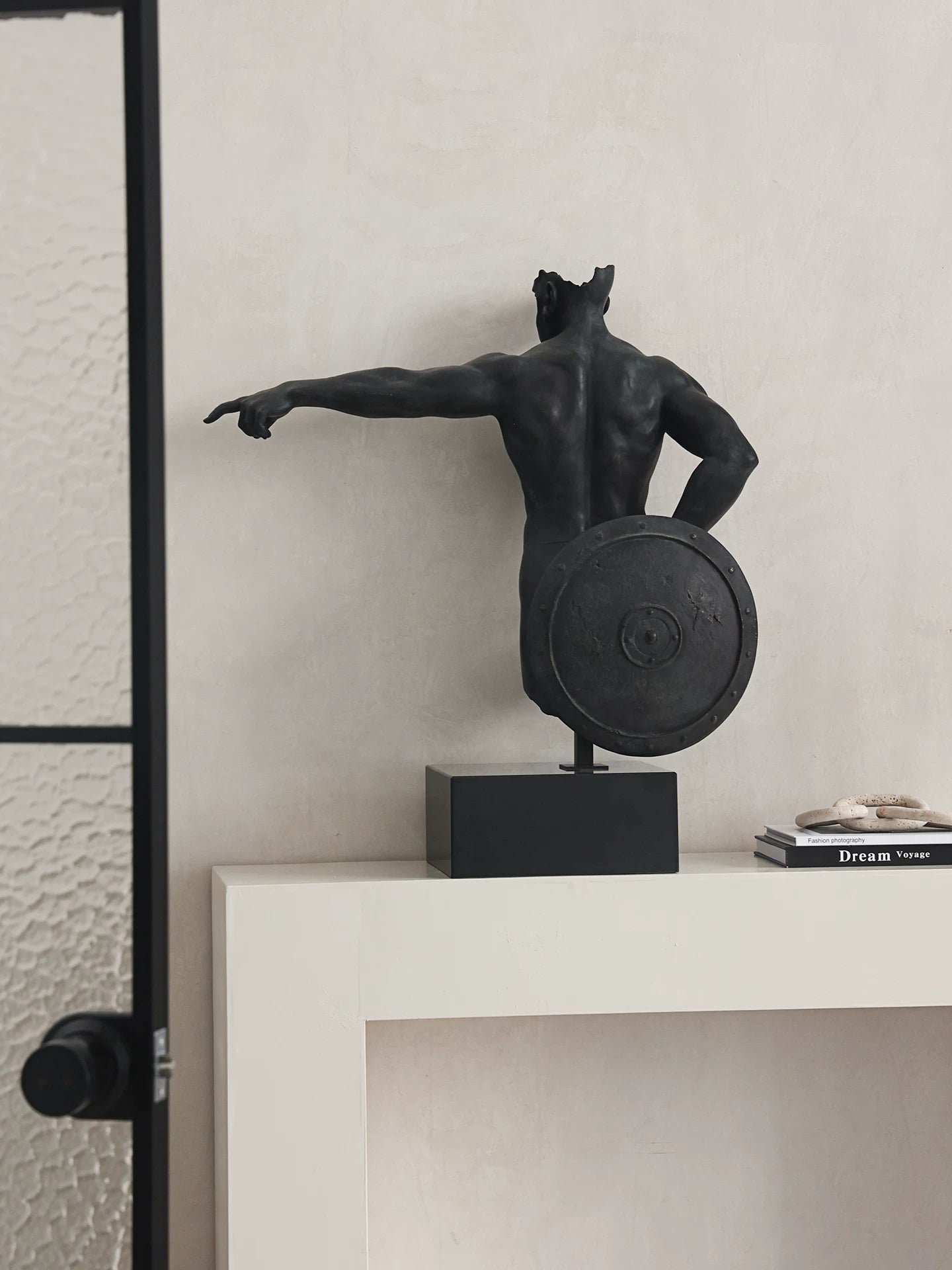 Elevate your space with the "Supersharp Retro" Shield Guard Sculpture by Maloona. This striking ornament adds a touch of modern artistry to any living room, entrance, or office.