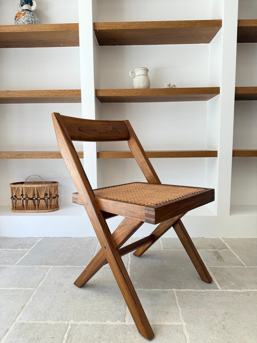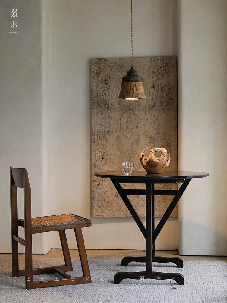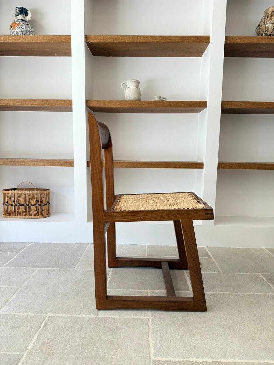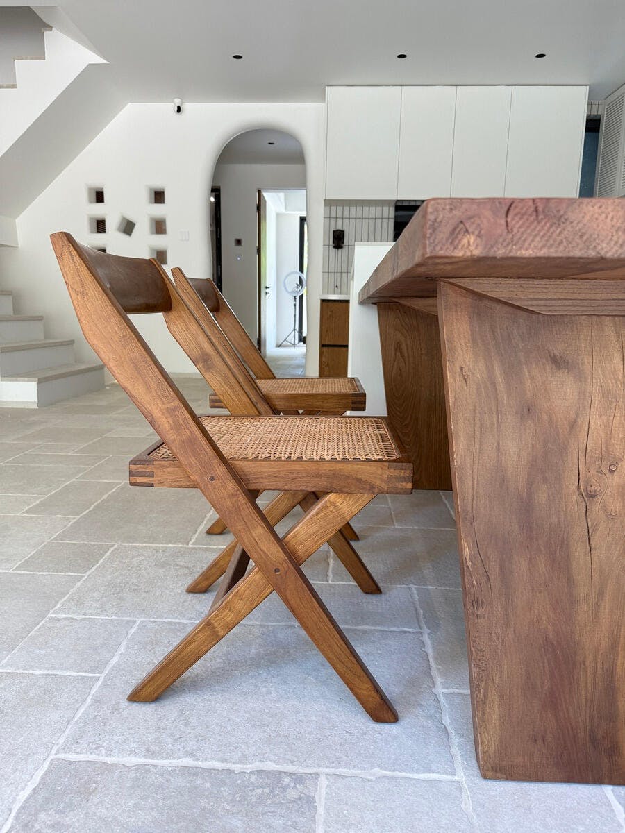 Elevate your dining space with the Wood/Chandigarh Chair from Maloona. This stunning piece blends Japanese Wabi-Sabi aesthetics with a medieval flair, featuring a solid wood frame and a comfortable rattan backrest.