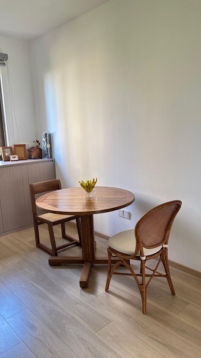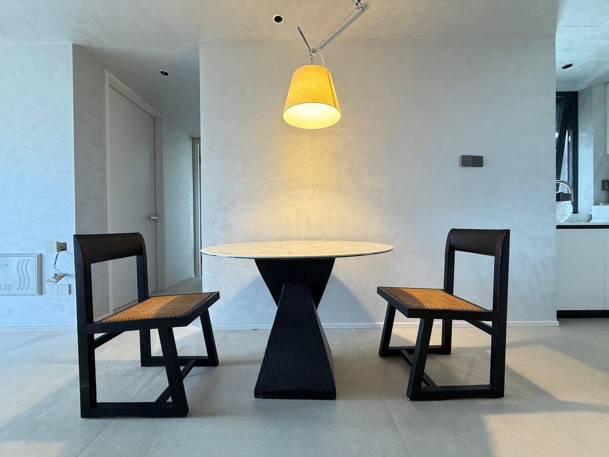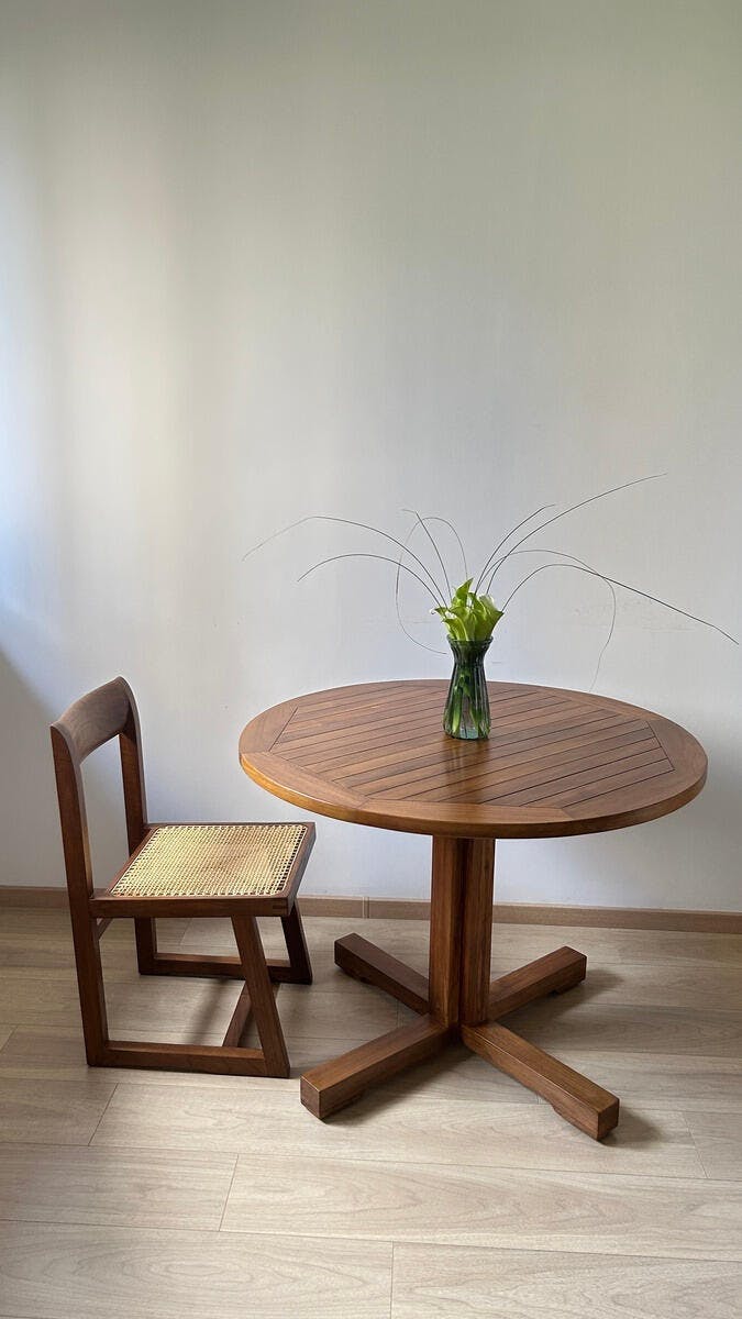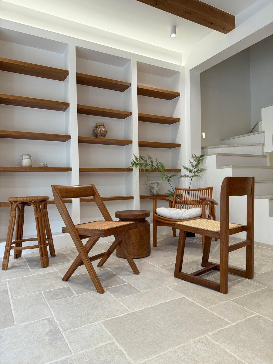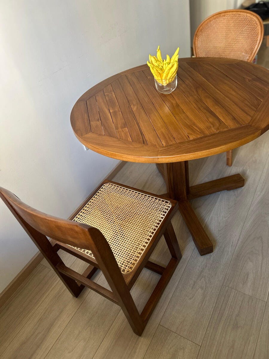 Elevate your dining space with the Wood/Chandigarh Chair from Maloona. This stunning piece blends Japanese Wabi-Sabi aesthetics with a medieval flair, featuring a solid wood frame and a comfortable rattan backrest.