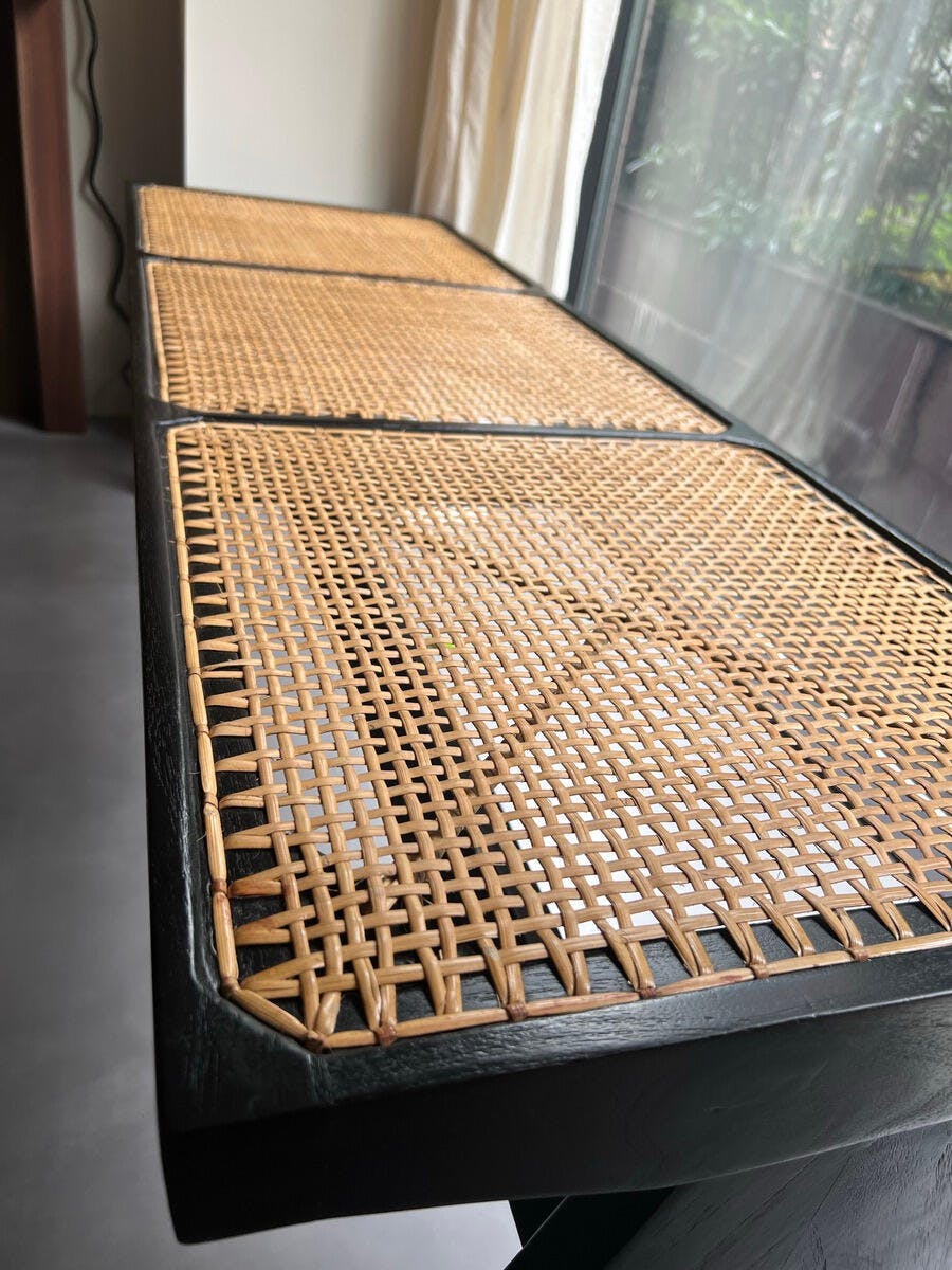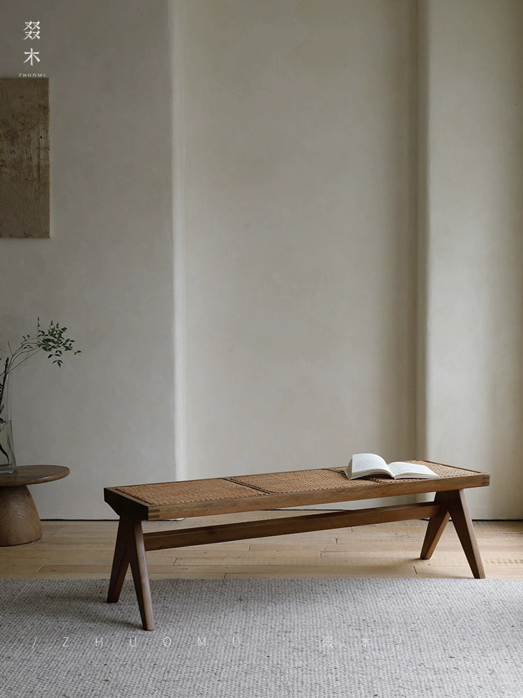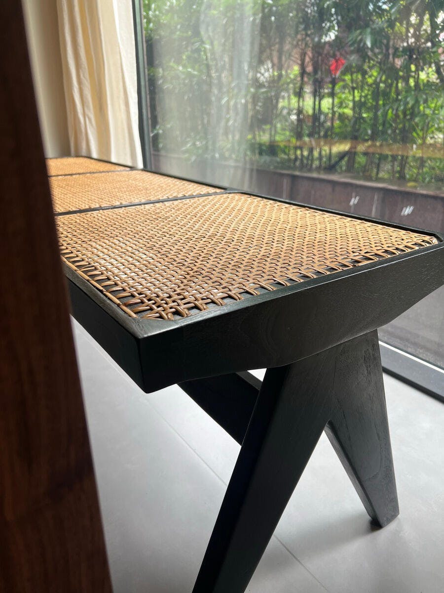 Elevate your dining experience with the Chandigarh Dining Table Bench, expertly crafted from solid wood and rattan. This versatile piece doubles as a stylish shoe-changing stool or bedside seat, perfect for any room in your home.